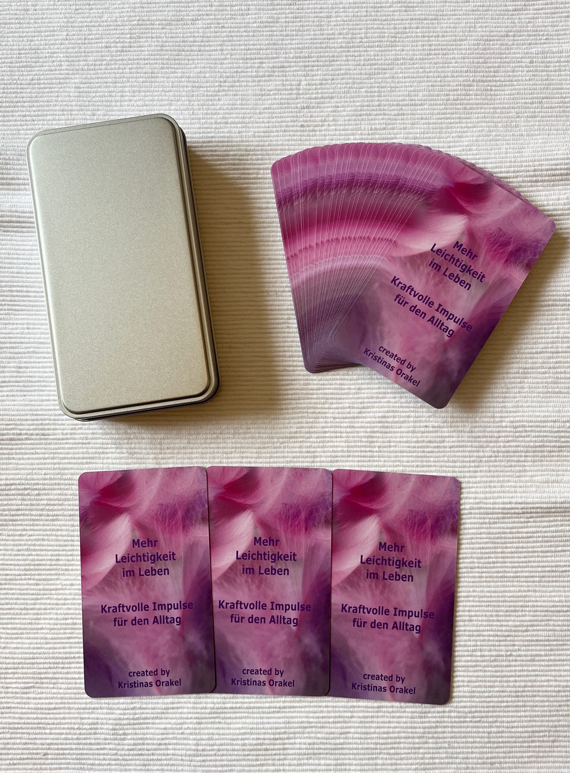 Diese Karten sind ausschließlich zu Unterhaltungs- und Inspirationszwecken gedacht. Sie ersetzen keine professionelle Beratung (z. B. psychologischer, medizinischer, rechtlicher oder finanzieller Art). Der Hersteller übernimmt keine Haftung für Handlungen oder Entscheidungen, die aufgrund der Karten getroffen werden.