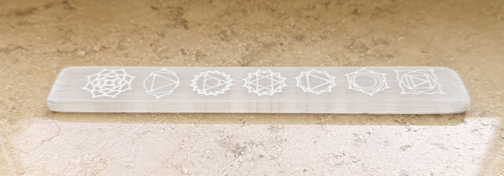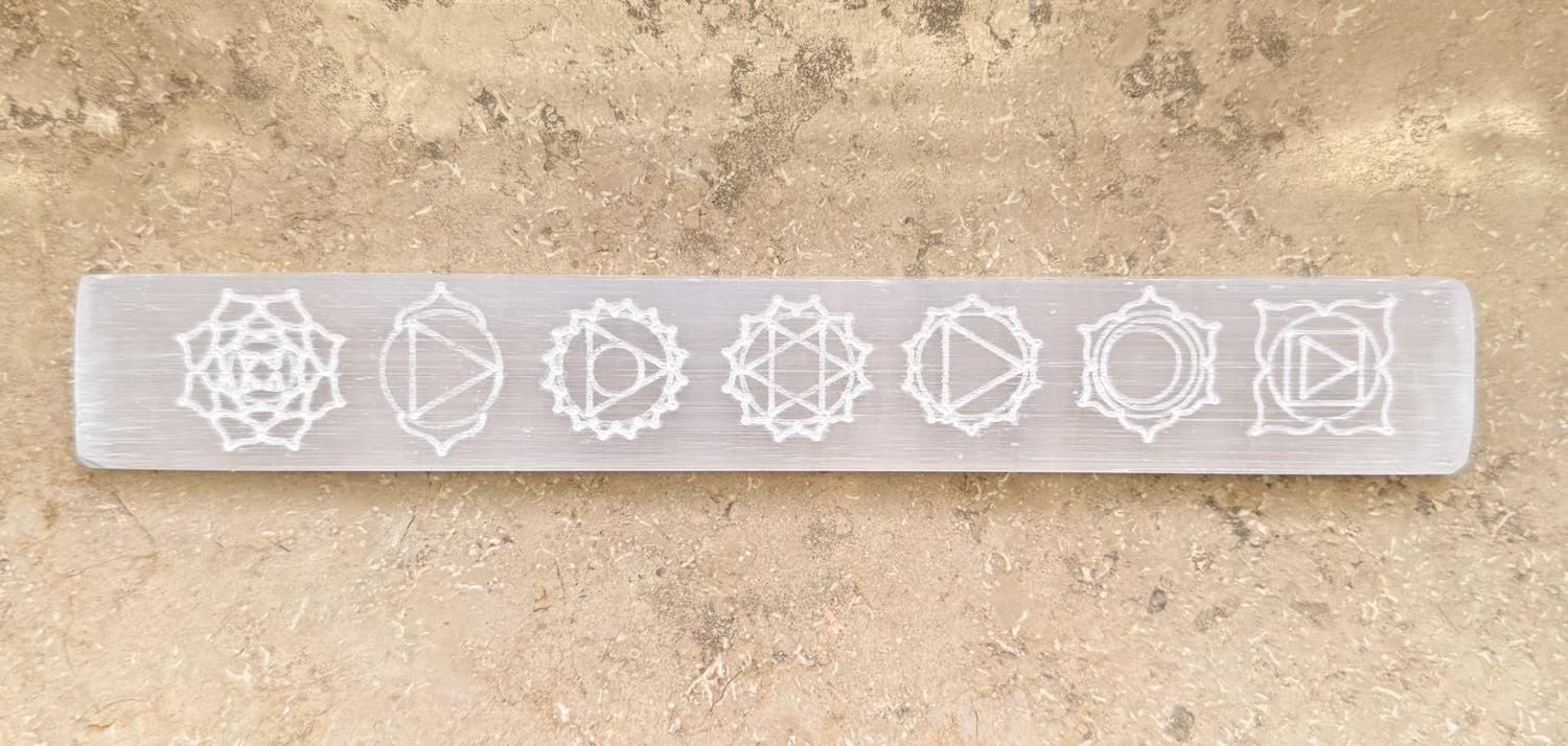 Rechteckige Selenitplatte mit Chakra-Symbolen