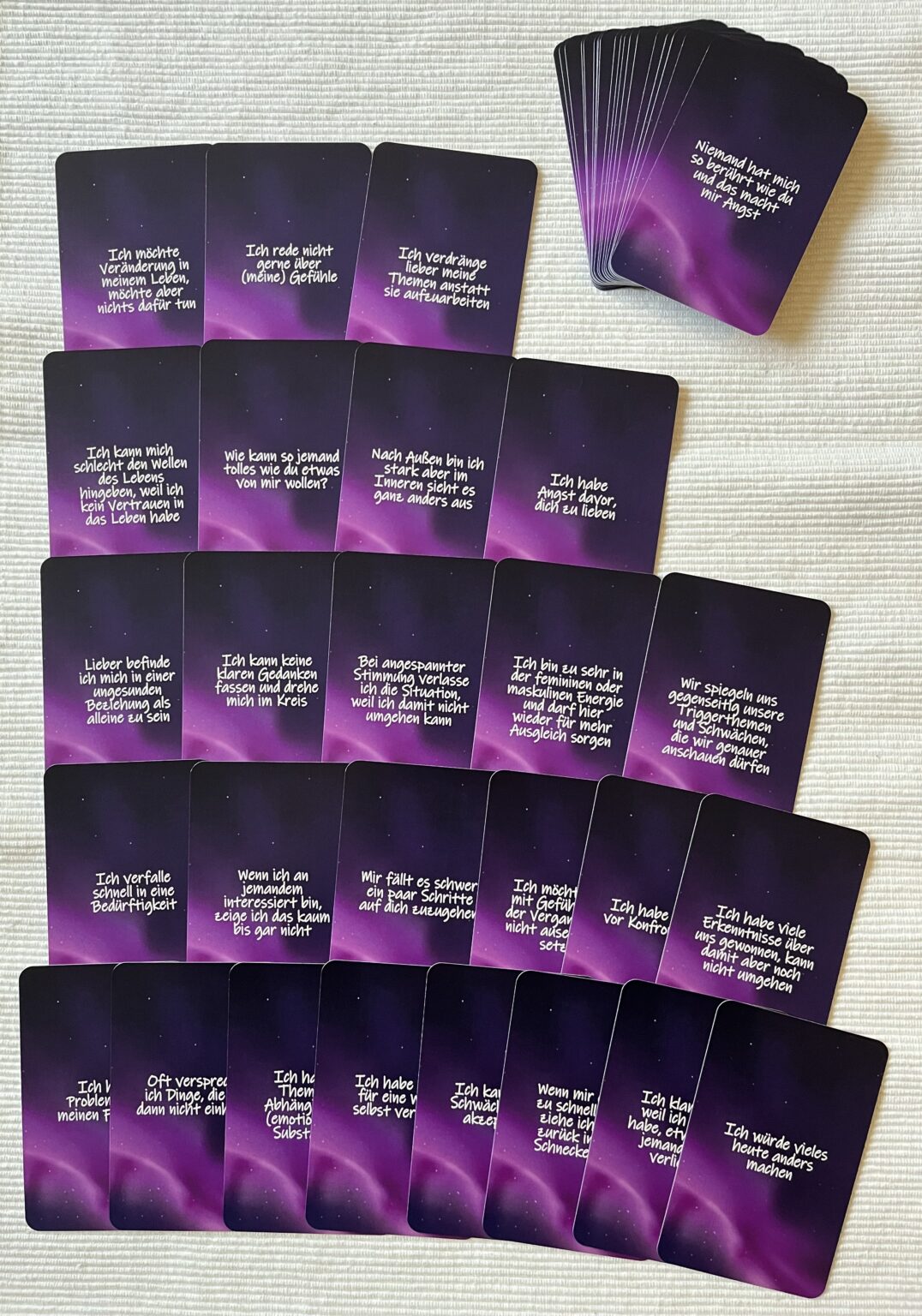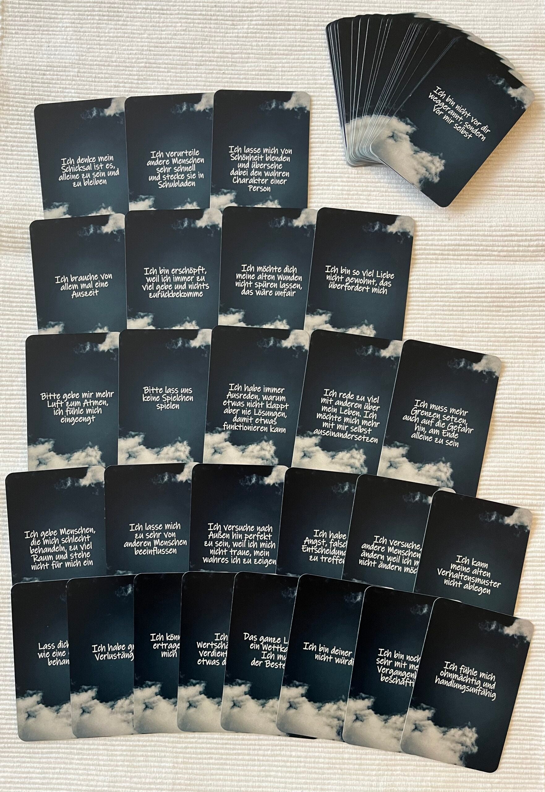 Diese Karten sind ausschließlich zu Unterhaltungs- und Inspirationszwecken gedacht. Sie ersetzen keine professionelle Beratung (z. B. psychologischer, medizinischer, rechtlicher oder finanzieller Art). Der Hersteller übernimmt keine Haftung für Handlungen oder Entscheidungen, die aufgrund der Karten getroffen werden.